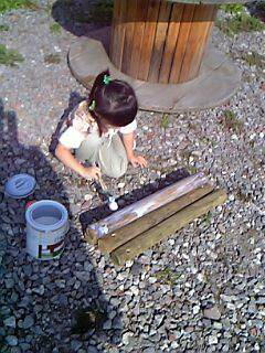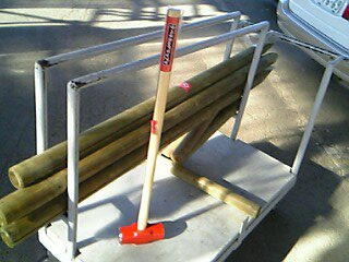 防腐剤加工の杭ですが、さらに防腐剤入りの水性ペンキ(透明)でコーティングしたあとに杭を打ち込みました