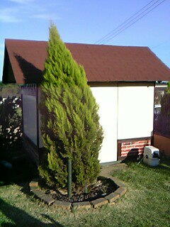 この頃のシンボルツリーは強風に耐えられず傾いてしまっていたので杭を打ったあとに縄で位置調整をして固定しています。